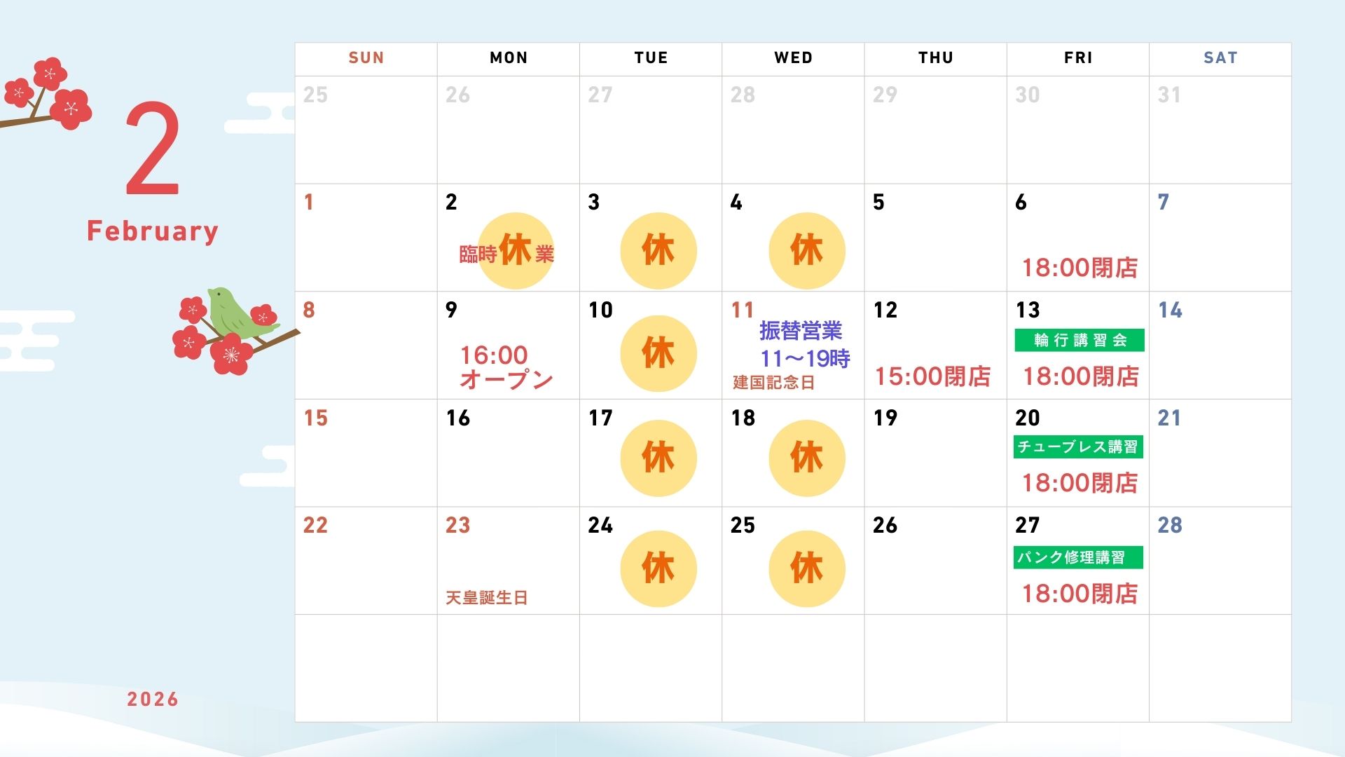 2/2(月) 臨時休業