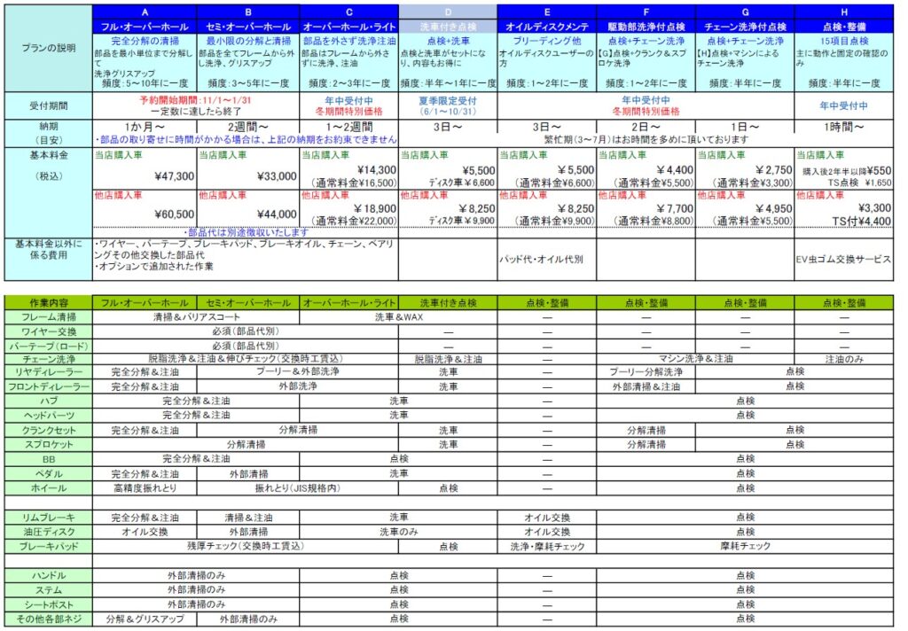 | 基本料金以外にかかる物 ・ワイヤー、バーテープ、ブレーキパッド、ブレーキオイル、チェーン、ベアリングその他交換した部品代 ・オプションで追加された作業 |